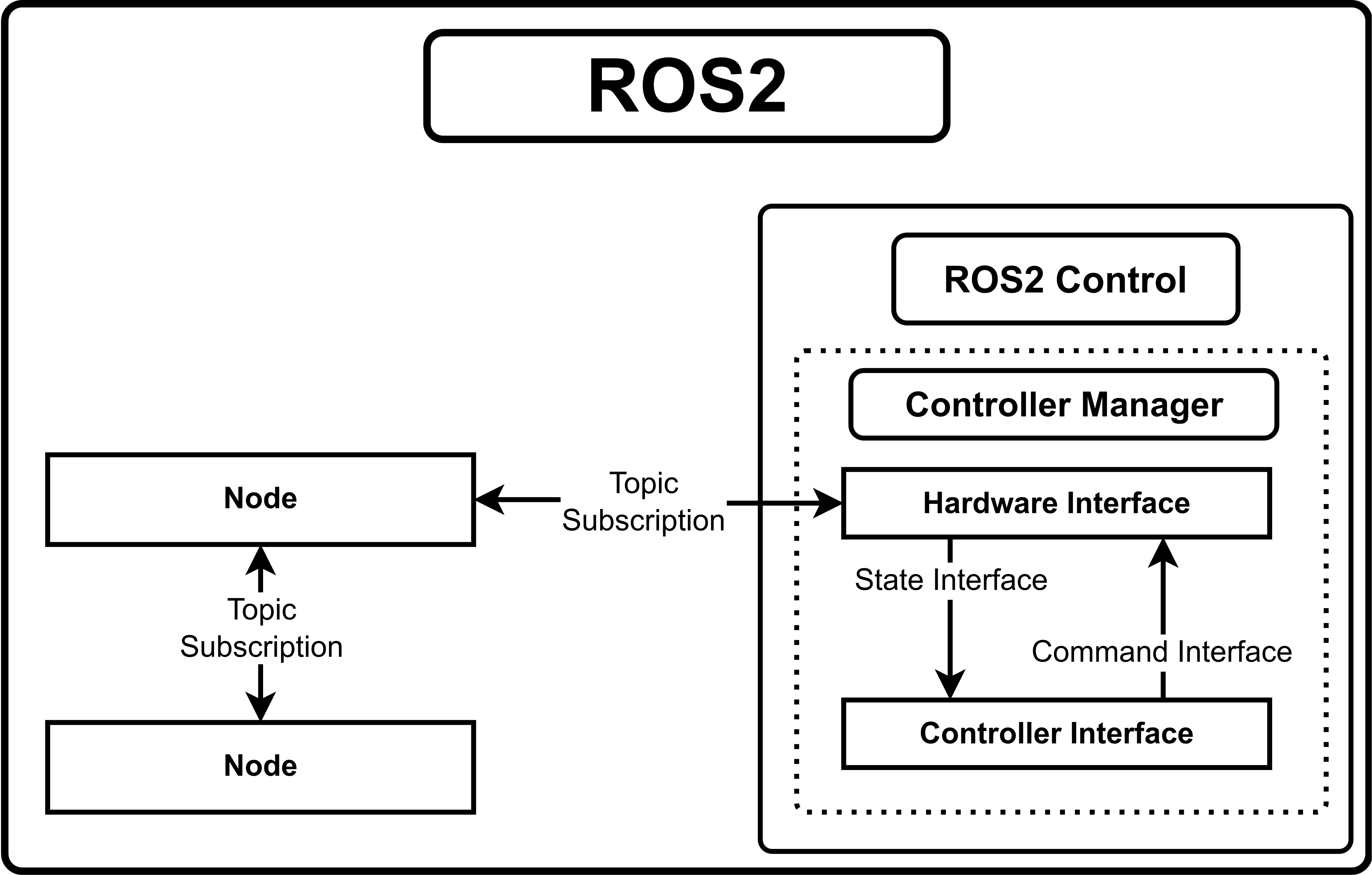 ROS2 Control is a sub-environment within ROS2 with it’s own rules. Programs written in ROS2 Control are exclusivity written in C/C++ and are called hardware interfaces and controller interfaces. These interfaces communicate via state and command interfaces. Generally speaking a hardware interface such as a motor will expose state interfaces for state information such as position, velocity, etc, and will expose command interfaces for data for commands which could be command position, torque, or PWM percent. For more information check out ROS2 Control !